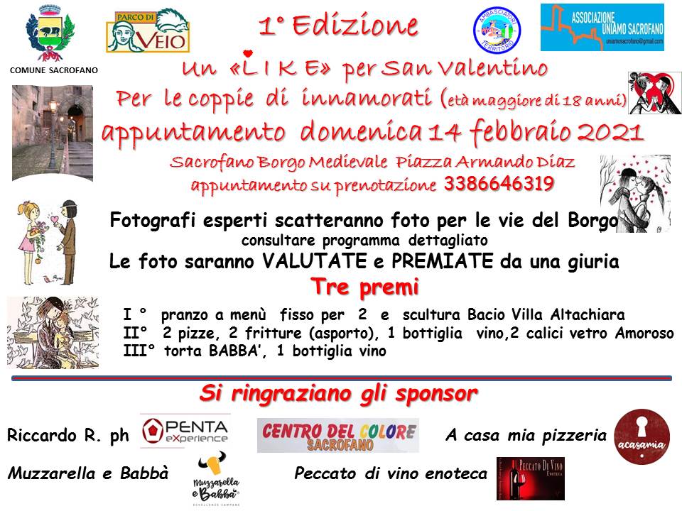 1° edizione Domenica 14 febbraio 2021 Sacrofano borgo medievale Piazza Armando Diaz • Organizzato da: UniAmoSacrofano e con la partecipazione di Riccardo Riccardi ph presso PENTAeXperience • Verranno rispettate le norme ANTICOVID-19 e il distanziamento sociale • Per informazioni rivolgersi a Beatrice tel. 3386646319 MODALITÀ DI PARTECIPAZIONE E PROGRAMMA; Le iscrizioni sono gratuite e aperteContinua a leggere “Un like per “San Valentino””